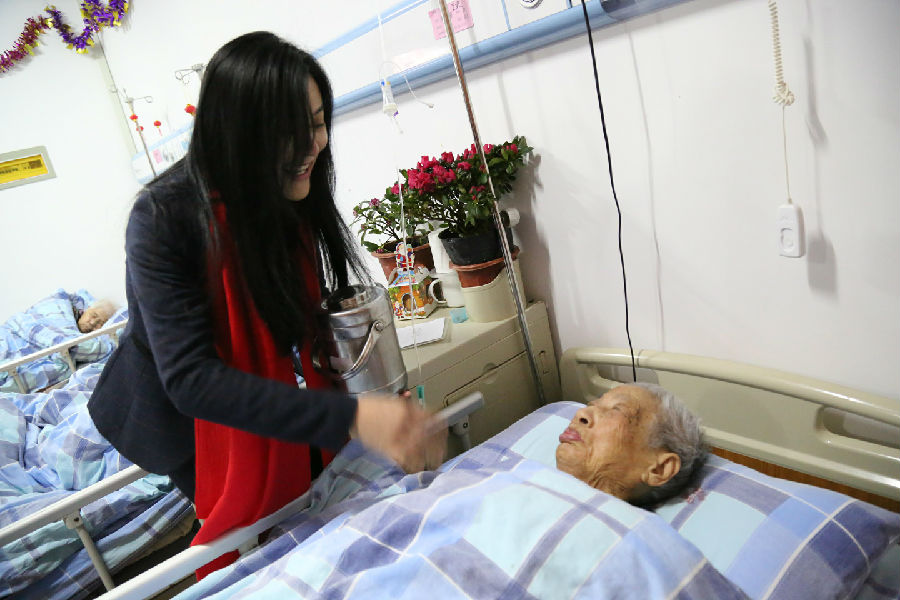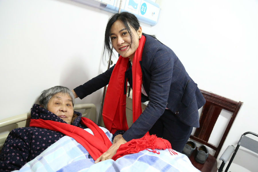 董事長(zhǎng)劉燕走進(jìn)病房看望老人